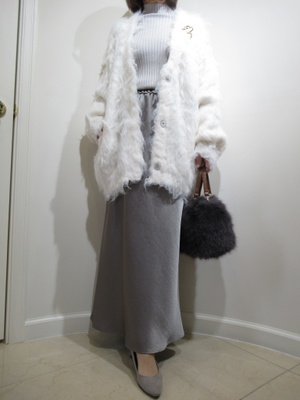 (シャギーニットのカーデをトップスに)ツヤのあるタイトスカートに同系色のタートルニットをシンプルにコーデ。プラス、ホワイトのシャギーニットカーデをざっくりと着こなして冬スタイルに。