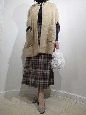 (ポンチョ風コートでオシャレに)お出かけスタイルにそろそろコートの出番。タイトのチェック柄スカートにポンチョ風のコートを羽織っておしゃれなコートファッションに仕上げました。