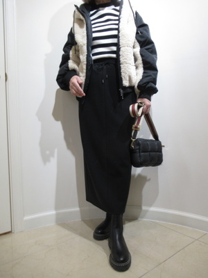(ボアのブルゾン、デイリーファッション)袖が異素材使いのボアのブルゾンはボリューム感があるのでボトムスはタイトのカジュアルスカートを合わせてみました。