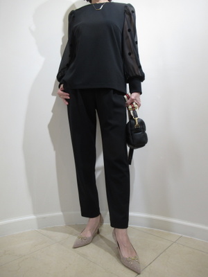 (セレモニー対応のアンサンブル)パンツスタイルのアンサンブルもパンツ派の方のセレモニー対応にぴったりです。ブラウスは少し甘めの透け感袖でおしゃれに。
