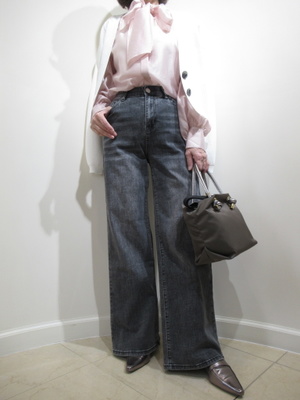 (グレーデニムをきれいめに)フレアデニムもグレー系だと上品な一着になる。フェミニンなブラウスを合わせてお出かけスタイルに。
