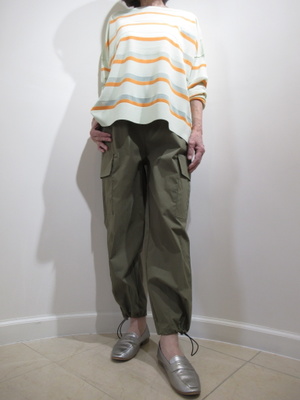 (カジュアルなパンツ)カーゴスタイルの裾しぼりパンツはカジュアルシーンにぴったりですね。オレンジを効かせたニットをチョイスして春らしいコーデに。