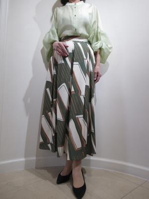 (春カラーでフレッシュに)黄緑のきれい色ブラウスは袖のボリュームがアクセントの春にふさわしい一枚。同系色のスカートをチョイスして。