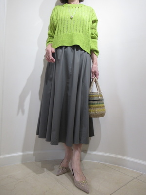 (透け感のニットは春色で)透け感で編地に変化をもたせたニットとギャザースカートを合わせました。ププラのギャザースカートは分量をたくさん使ったボリュームのあるシルエットが特徴です。