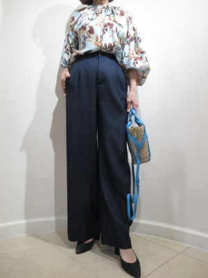 (アッシュローブのパンツでスタイリッシュに)ソフトフレアなシルエットがきれいなパンツは柄ブラウスでスタイリッシュなコーデにしてみました。