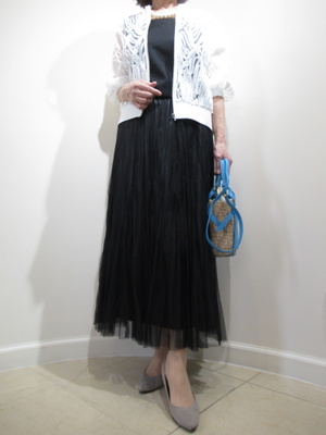 (シースルーのエレガントブルゾン)メッシュ素材にシフォン生地を重ねておしゃれに仕上げたブルゾン。合わせたチュールスカートで華やかなコーディネートに。
