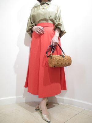 (きれい色のスカートで)オレンジ色のスカートはフレアタイプのウェストマークデザイン。合わせたブラウスはドルマンスリーブですがスカートインしてコンパクトにコーデしました。透け感のあるおしゃれに一枚です。