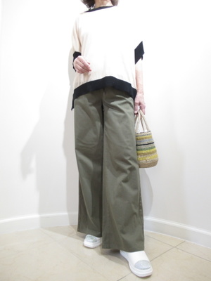 (デイリーもおしゃれに)スクエアデザインのニットをデイリーに。カジュアルパンツと組み合わせて軽やかに。普段着もちょっとおしゃれにしたいですね。