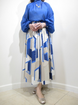 (ブルーのきれい色コーデ)発色の良いブルーのブラウスとその一色をスカートの中の色とリンクしてブルーでつないだフェミニンコーデ。ふんわりシルエットの柔らかな春らしいコーディネート。