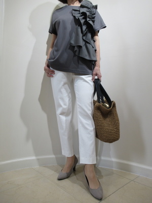 (モチーフ使いのカットソー)片方に大きめなモチーフをあしらったカットソーはそれだけでおしゃれに着こなせますね。テーパードパンツですっきりと。