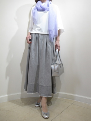 (白×グレーの大人フェミニン)うすいグレー色で上品なスタイルに合わせるのはやっぱり白がおすすめ。淡い色のパープルをプラスすることでさわやかな初夏を感じる。