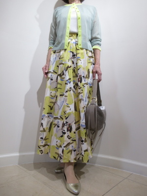 (花がらのフェミニンスカート)春を感じる淡いトーンの色でまとめたスカートコーデ。黄色の花がらをカーデにリンクしてフェミンなお出かけスタイル。