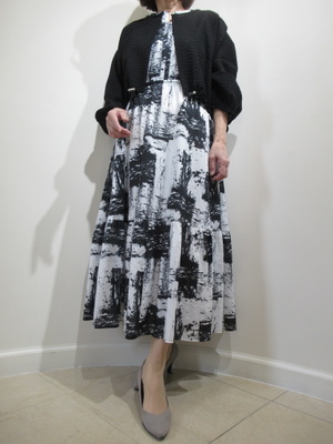 (白×黒ワンピース)モノトーンで作るコーデはエレガントなワンピースもとてもシャープに落ち着いたスタイルになりますね。