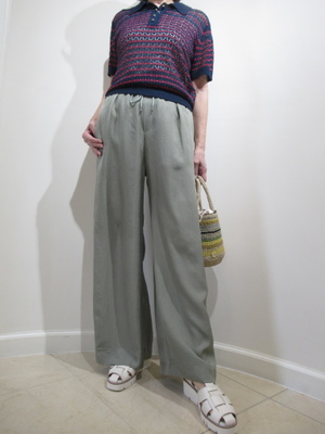 (とろみのワイドパンツでカジュアルに)生地がとろっとした落ち感があるのできれいなシルエットがおしゃれなパンツ。ポロデザインニットでカジュアルに。