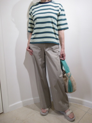 (デイリーはカットソーで)夏のデイリーはカットソースタイルが定番です。何枚あっても困らないですね。チノパンツでカジュアルに・・・スポーツサンダルでお出かけスタイル。