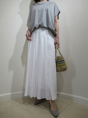 (シンプルなカットソーコーデ)ププラのゆるシルエットのカットソーは程よいフィット感で着心地の良いカットソーです。あえてシンプルに夏のロングギャザースカートでさらっと合わせてフロントはインしてスッキリと。