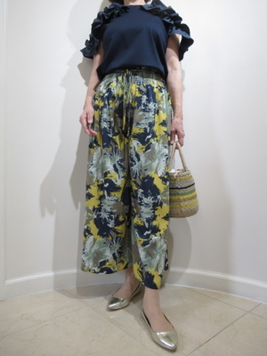 (柄のパンツでおしゃれに)とろみのある生地を使用したパンツは色々な色の混じったフレアパンツ。今回は胸元のフリルがキュートなカットソーにコーデして。