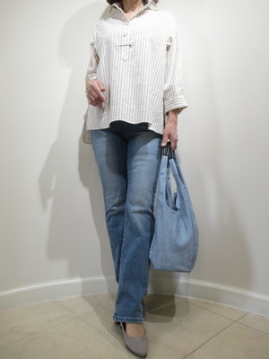(休日はストライプのシャツで)丈の長めのシャツはプルオーバーでざっくり着れてその上おしゃれなデイリーファッションができる。ブーツカットのデニムで足元はすっきりさせるとバランスの良いコーデになる。
