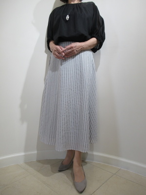 (透け感のあるトップスでコーデ)透け感のある生地を使用したブラウスはお袖もしっかり肘までカバーしてくれる万能デザイン。胸元のタックギャザーでフェミニンな印象に。明るめグレーの優しい色合いのスカートはウェストマークでメリハリのあるフェミニンコーデに仕上げました。