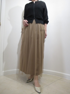 (チュールレースのスカートを着る)チュールレースを重ねたカーゴスカートにはトップスもカジュアルなブルゾンタイプのカーデを組み合わせて。このカーデもレース使いで透け感のあるおしゃれな1枚です。