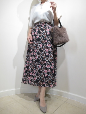 (フレアスカートで清楚に)膝下のミモレ丈スカートは清楚なブラウスコーデがいい。トップスは丈が長いのでパンツでもOKですが今回はインにして着用してみました。