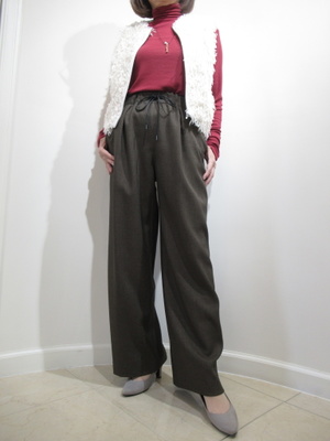(ファーベストを着る)茶系のソフトワイドパンツにボルドーのカットソーがよく合う。秋のコーデ+ファーベストを重ねてより秋のファッションを楽しく。