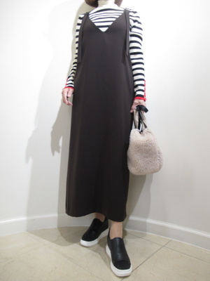 (大人のジャンスカコーデ)濃いブラウン系のジャンスカは黒より優しい印象を与えてくれるので、より上品さが出る。インナーはカジュアルにボーダーニットをチョイス。茶に相性の良い赤色が袖口にプラス。