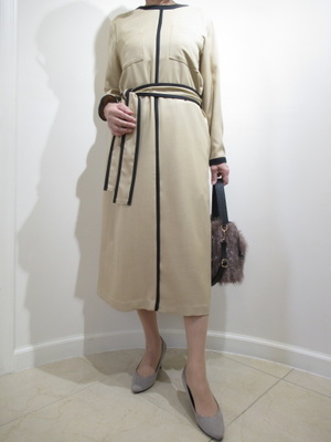 (きちんと感のあるワンピースコーデ)トリミング使いのメリハリのあるデザインは一枚できちんと感が出る。お出かけにとて便利な一着です。
