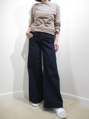 (デニムコーデはOFFに重宝)デイリーには動きやすいファッションがおすすめ。ワイドのデニムはスニーカーコーデがぴったり。トップスはボーダーの長袖カットソーで。