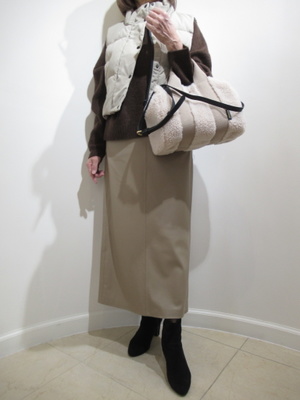 (軽やかダウンベスト×レザースカート)ブラウン×ベージュのナチュラルトーンでまとめた大人の冬コーデ。ボリュームニットにライトダウンベストを重ね、軽さと暖かさを両立。フェイクレザースカートで上品さをプラスし、もこもこ素材のバッグが季節感を引き立てます。