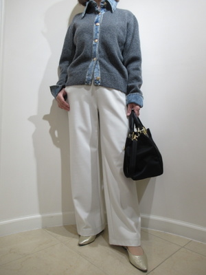 (デニム×ニットのドッキングニットが主役のコーデ)デニムシャツをドッキングしたニットが主役の大人の抜け感たっぷりコーデ。グレー×オフホワイトの組み合わせは、清潔感と柔らかさを両立してくれます。ゆったりニットに、すらっと落ちる白パンツを合わせてシルエットもスッキリ。きれいめバッグをアクセントに上品さをプラス。