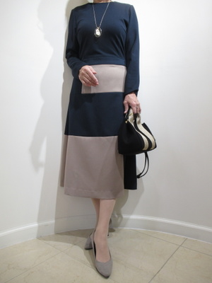 (配色デザインがすてきな大人の品格ワンピース)ネイビー×グレージュのブロッキングが目を惹く、大人の品格ワンピーススタイル。ウェスト位置の切り替えが自然にスタイルアップし、立ち姿まで美しく見せてくれます。上半身はすっきりと、スカートは柔らかく揺れる上品なフレアラインが魅力。フォーマルにもお出かけにも活躍する、華やかさと落ち着きを兼ね備えた一着です。