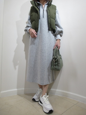 (カーキのショートダウンベストでデイリーを楽しく)きれいめカジュアルワンピースにショート丈ダウンベストを重ねた冬の大人カジュアルコーデ。グレー×カーキの落ち着いた配色で、可愛さと抜け感を両立しました。スニーカー合わせで軽快に、デイリーのお出かけにもぴったり。