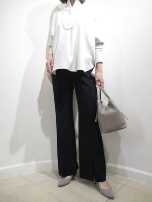(大人気のきれいめシルエットパンツ)上品なとろみのあるブラウスに、すっきりとしたブーツカットのブラックパンツを合わせた大人のきれいめコーデ。首元のデザインが程よい抜け感を演出し、顔周りを優しく見せてくれます。ヒップまでさりげなくカバーする丈感で、体型を選ばず着用可能。パンツの縦ラインが脚をきれいに見せ、全体をすっきりとした印象に。