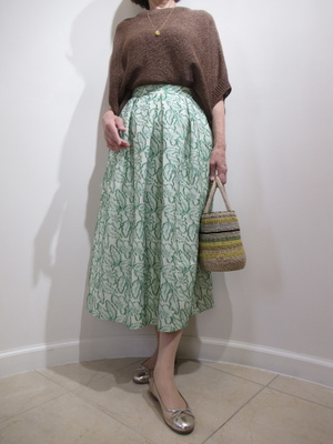 (ブラウン×グリーンコーデ)やわらかなブラウンニットに華やかなジャガードスカートを合わせた上品コーデ。立体感のある花柄が、コーデに程よい華やかさをプラスしてくれます。ゆったりとしたニットは体のラインを拾わず安心感のある着心地。ウェストインすることでバランスよくすっきりとした印象に仕上がります。
