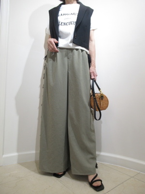 (短丈ジレとフリンジパンツのエレガントな装い)パンツの脇にフリンジをあしらったエレガントなおしゃれパンツ。あえてロゴTと組み合わせ+短丈テーラードジレを足して。スタイリッシュなエレガントコーデの完成。