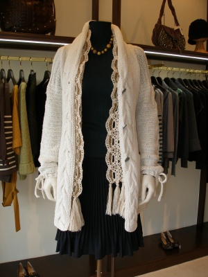 ニットコートの袖に注目。ぎゅっと絞ってリボン結びにして・・・。長さも程良いのでスカートでもOKです!スタイリッシュ度80%、フェミニン度20%。