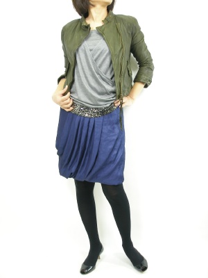 辛口のレザージャケットはバルーンスカートの甘さを引き締めてくれます。レザーアイテムは春も使えるので今のうちに手に入れたいですね!スタイリッシュ度90%、エレガンス度10%。