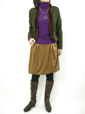 パープルとカーキの色合わせはさりげなくオシャレ上級者に見えるはず!スタイリッシュ度70%、フェミニン度30%。