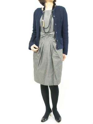 クラシカルワンピに綺麗目カーデで定番的なコーディネート。でもウエストのリボンで今の雰囲気に!エレガンス度70%、フェミニン度30%。