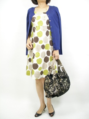 ちょっぴりレトロな柄ワンピに、色ものカーディガンをちょこんと乗せて清楚な雰囲気に!フェミニン度90%、エレガンス度10%。