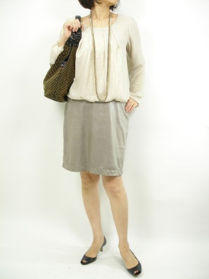 上品な光沢素材のタイトワンピースは、それだけで存在感抜群です。ロングネックレスでアクセントをつけて!スタイリッシュ度80%、エレガンス度20%。