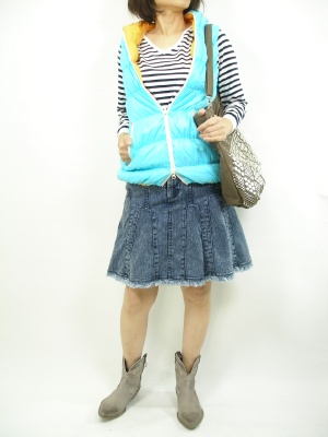 春と言ってもまだまだ寒い日は続きます。そんな時には、こんな明るい色のダウンベストで、防寒と春気分の両方を欲張っちゃいましょう!アクティブ度90%、フェミニン度10%。