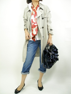 トレンチコートは春には欠かせないアイテムです。シャツにスカーフでカチッと決めてパンツはデニムで外してみました!スタイリッシュ度100%。