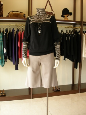 ニットのスクエアカットとボーダーのカットソーの色を揃えて地味色を可愛くコーディネート!フェミニン度80%、アクティブ度20%。
