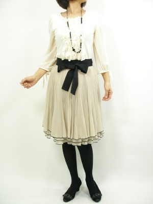 フリルフリルのブラウスにリボンのフェミニンスカートを合わせて思いっきりエレガントさを強調。黒のアクセとスカートのリボンをリンクさせて!エレガンス度80%、フェミニン度20%。