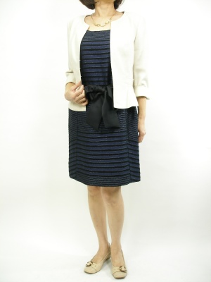 フェミニンなデザイン同士も、ベージュとネイビーの組み合わせなら知的なイメージに!エレガンス度80%、フェミニン度20%。