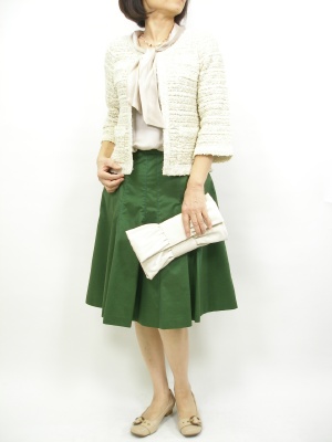 お出かけコーデもグリーンのスカートで少し個性的に。小物はベージュでまとめると上品です!エレガンス度60%、フェミニン度40%。