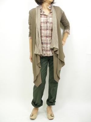 チェックのシャツとカーゴパンツはカジュアル派の定番ですね。そこにドレープカーデを加えると一気にオシャレ感がアップしますよ!アクティブ度90%、スタイリッシュ度10%。
