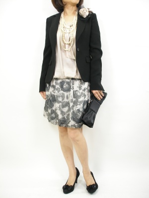 黒とベージュの落ち着いた色合わせは素材感にこだわりたい。シルクのブラウスやパールのネックレスで華やかさがプラスされます!エレガンス度80%、フェミニン度20%。